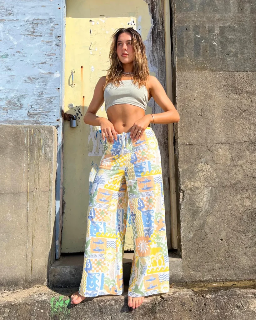 Printed pants bring color, flow, and personality. Think tropical motifs, abstract swirls, or micro florals. Pair with a solid tube top or bandeau to keep it balanced.