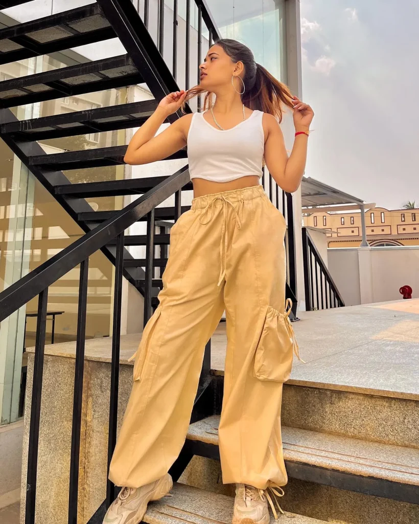 This look pairs delicate and daring, soft and structured. The bandana top is flirty and fun, while cargos give street-style edge.
