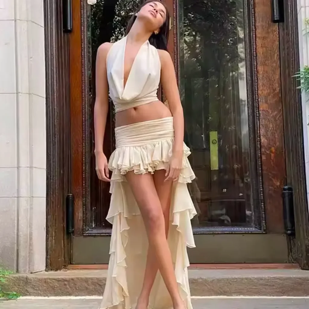 15. Ruffled Skirt + Backless Top – Feminine with a Twist