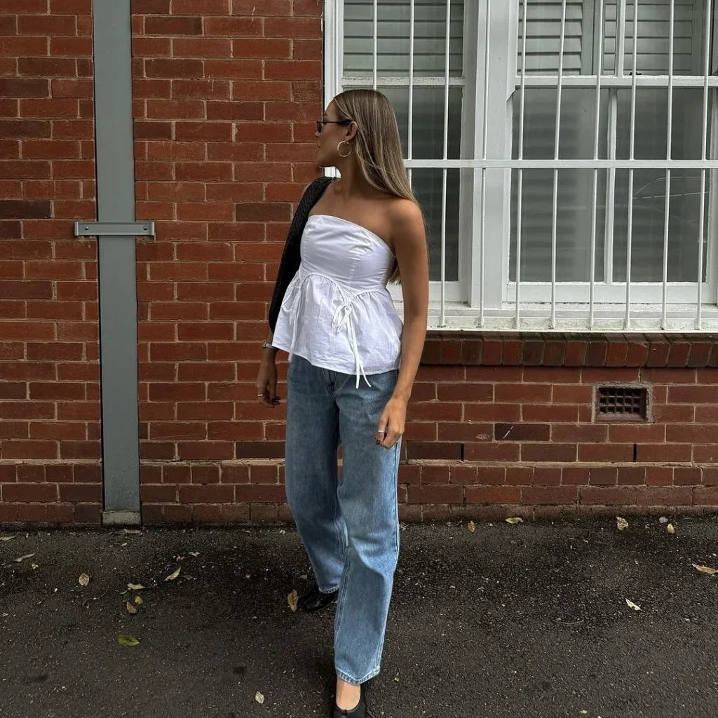 A strapless peplum top brings the drama while keeping things flirty and wearable. Pair with high-waisted jeans for that perfect night-out balance.