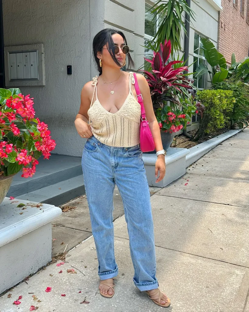 6. Crochet Top + High-Waisted Denim – Boho Revival Energy