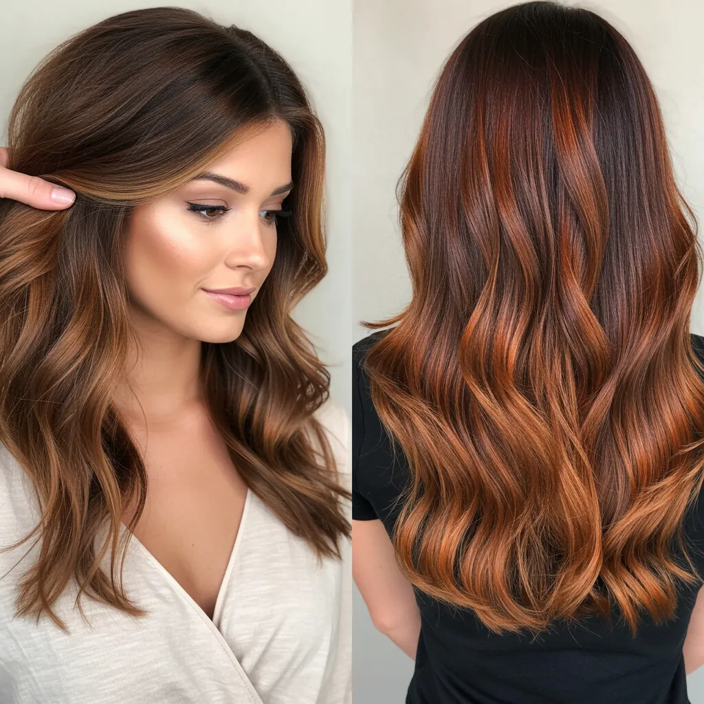 A rich copper tint over a brunette base creates a fiery, sunset-inspired effect.