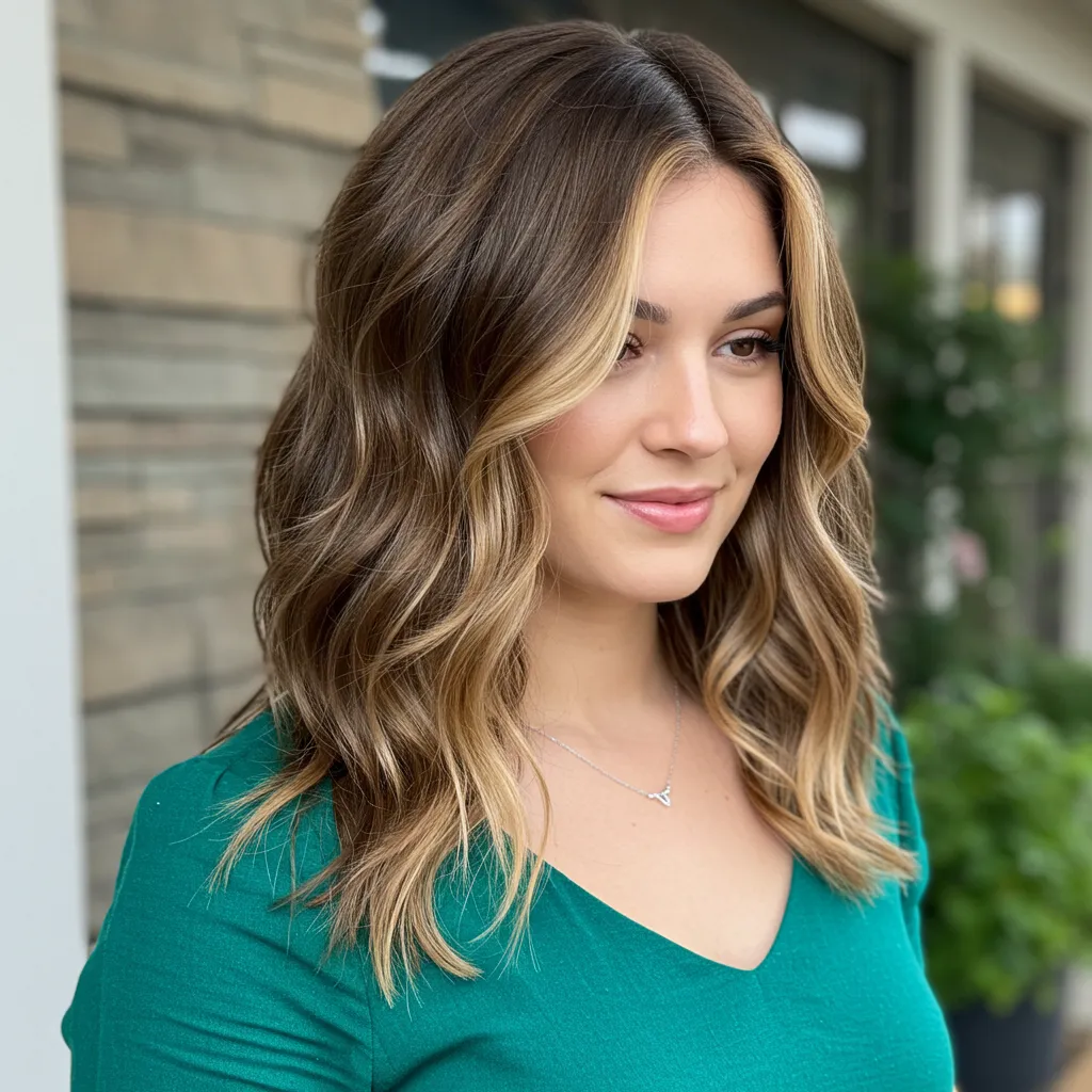 Lighter caramel strands woven into dark hair create a natural yet striking effect.