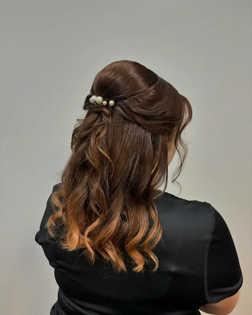Request a “classic half-up, half-down style.” Specify if you want the top section “sleek and smooth” or with “some volume at the crown.” Discuss finishing the lengths (straight, wavy, or curly).