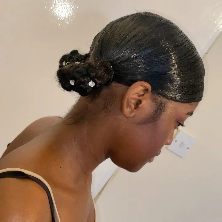 Request a “sleek low bun at the nape.” Emphasize wanting the roots completely smooth with a sharp part (center or side). Ask for a “tight, neat bun.”