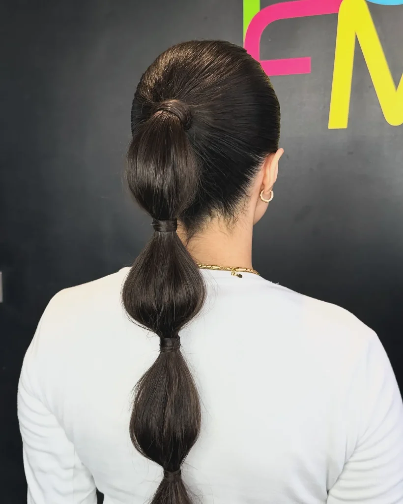 Ask for a “high, sleek ponytail.” Specify wanting the roots completely smooth and the ponytail itself polished. Request hair wrapped around the base.