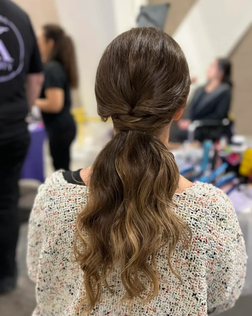Request a “low ponytail at the nape,” specifying if you want it “sleek and polished” or “soft and slightly textured.” Ask about wrapping hair around the base.