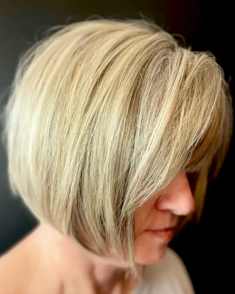 A layered bob with side-swept bangs is a versatile, stylish look that works well for both casual and formal occasions. The bangs add a playful touch, while the layers keep the hairstyle fresh and modern.