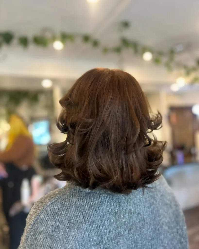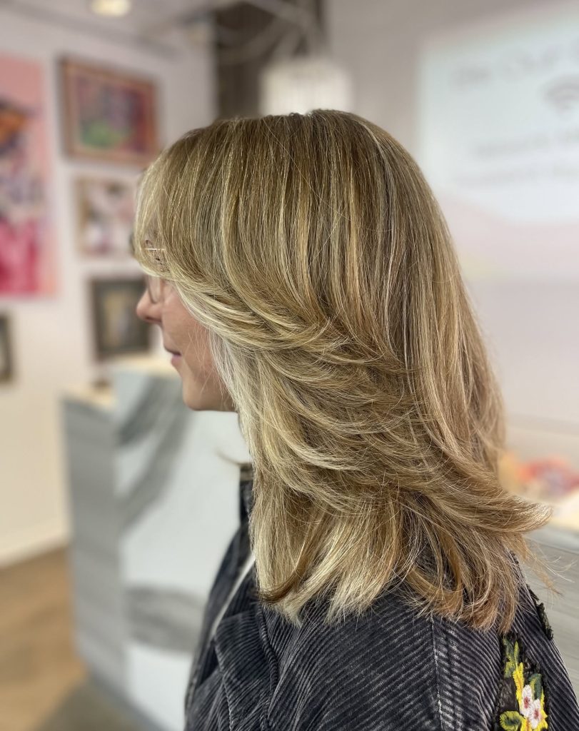 Feathered layers create movement and softness. This style frames the face beautifully and works well with medium-length hair.