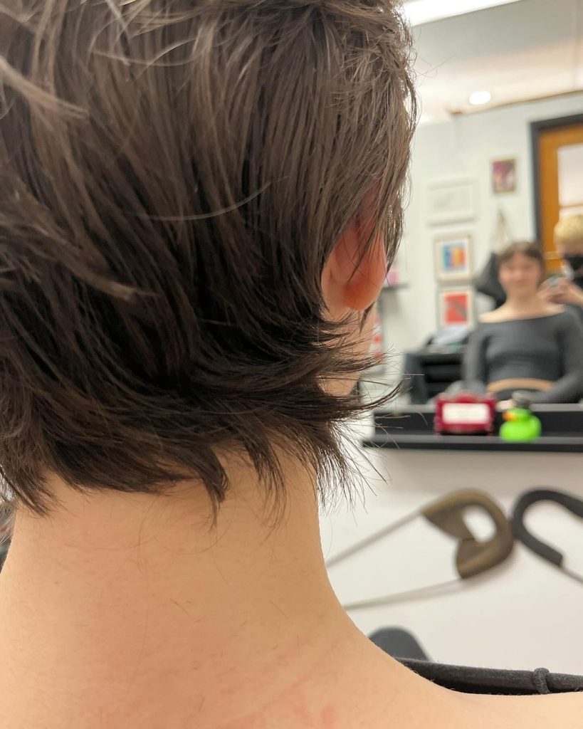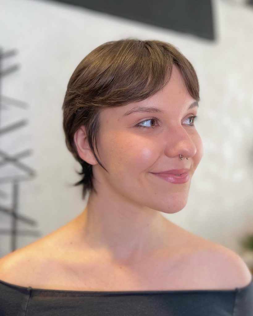 A feathered pixie with soft, wispy layers adds a touch of elegance to your look. It’s great for adding movement.