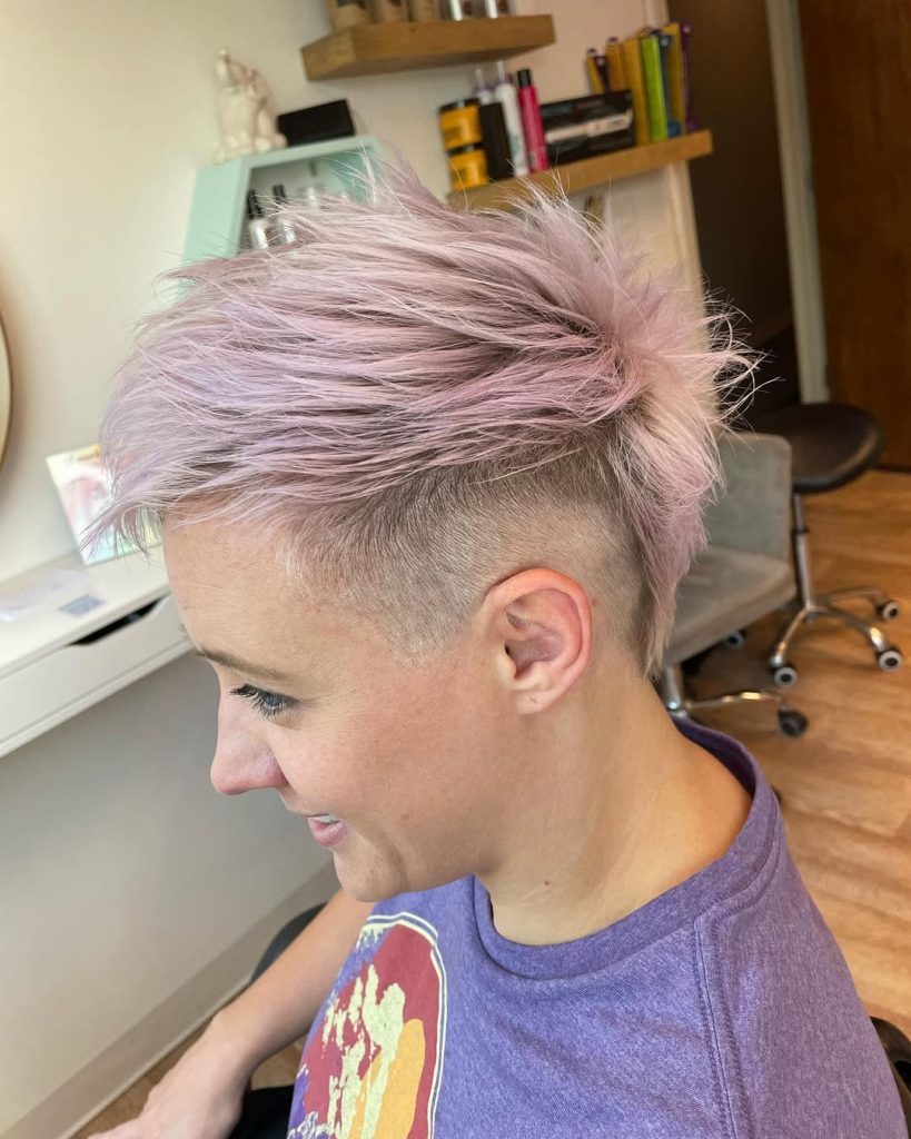 A side-swept pixie cut adds a romantic, feminine touch. Perfect for softening your facial features.