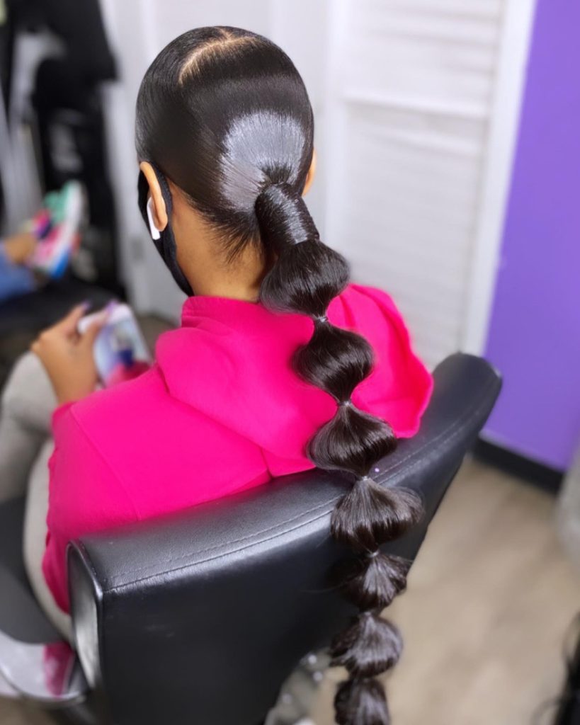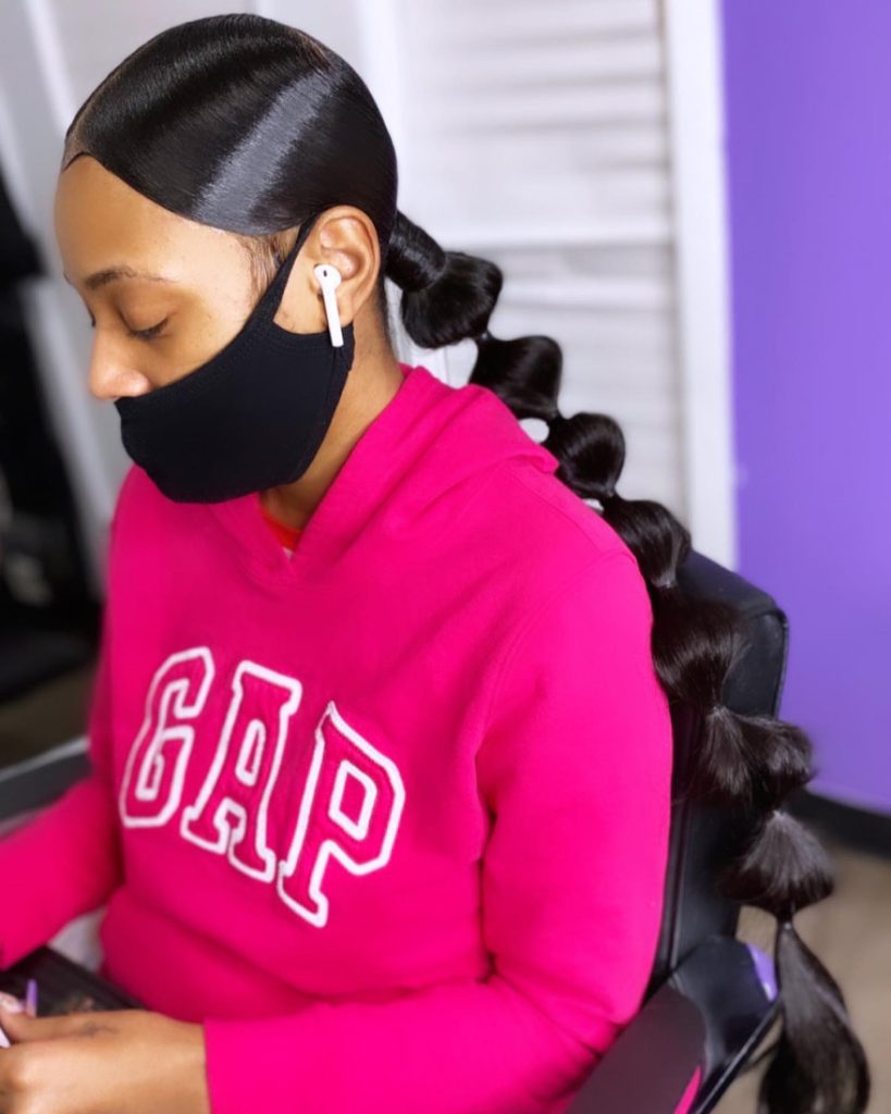 The bubble ponytail is a playful and trendy style. Create sections in your ponytail with elastic bands, and let the bubbles peek out from under your hoodie.