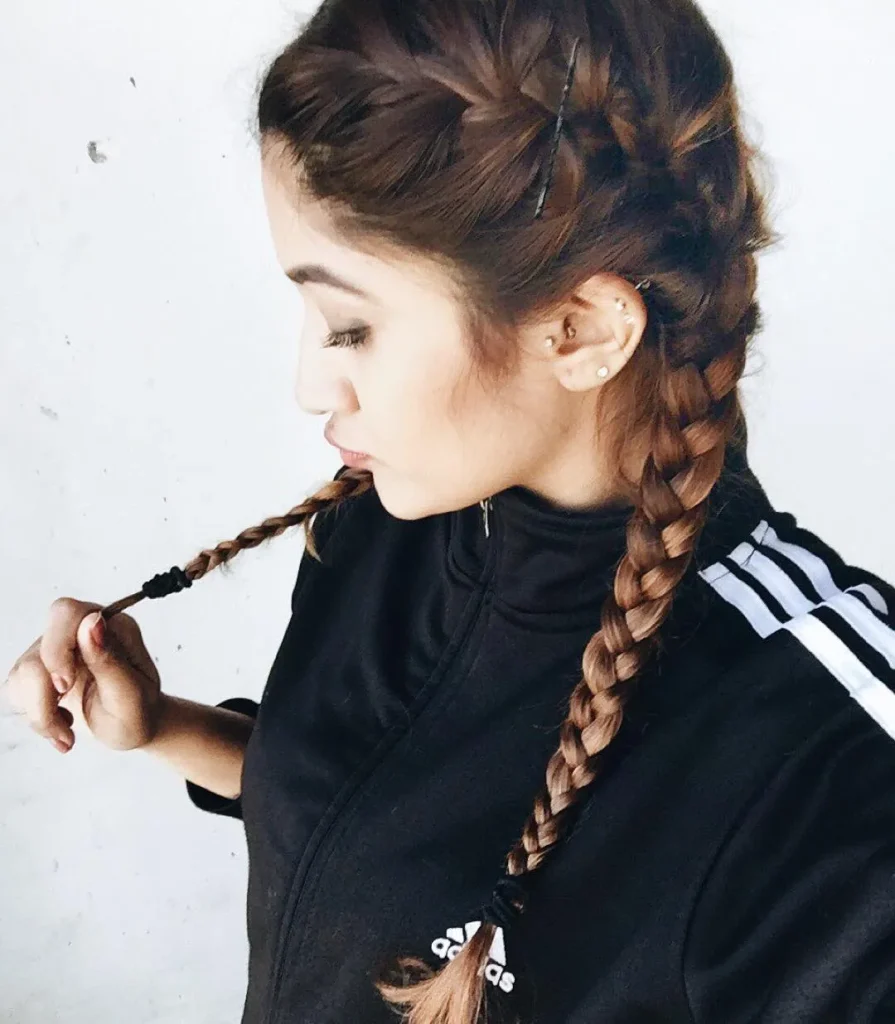 Double French braids are a trendy, youthful style that pairs perfectly with a hoodie. These braids keep your hair neatly tucked and give you a fresh, sporty look.