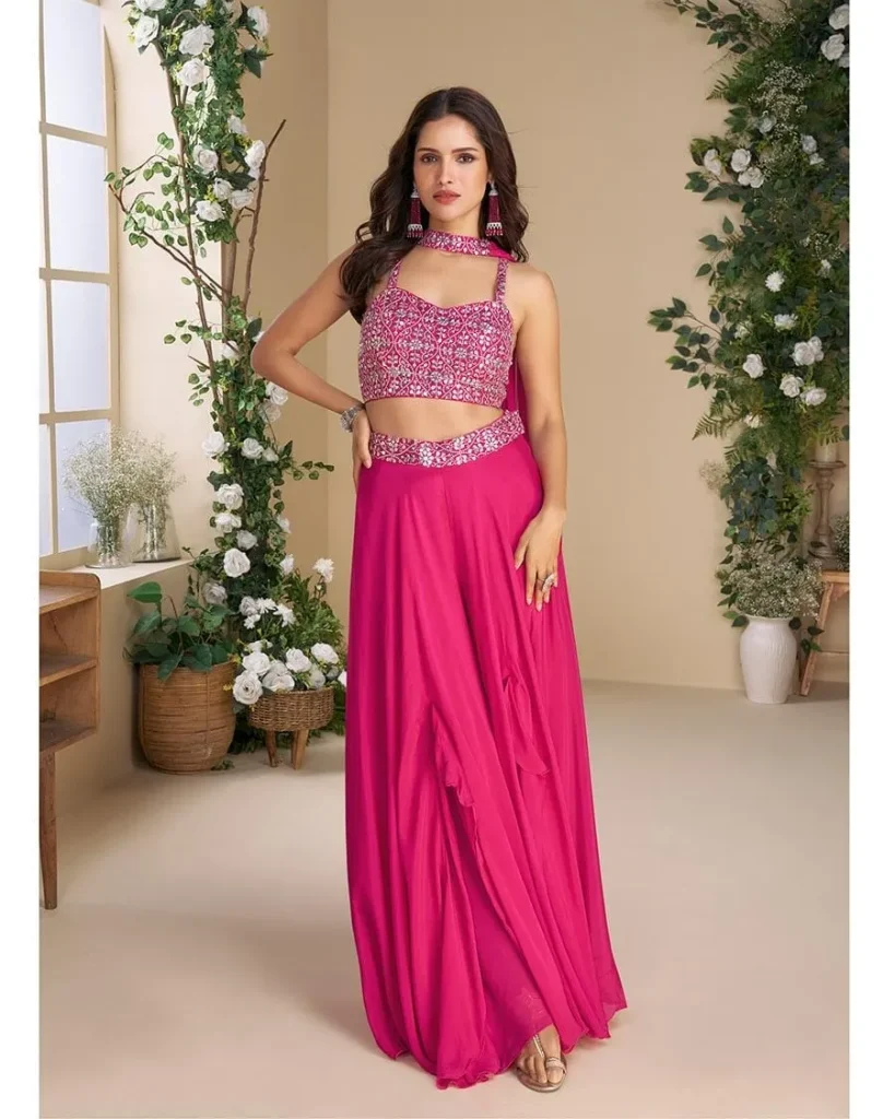 The sharara offers a more dramatic silhouette. It is a festive and contemporary choice rooted in traditional design.