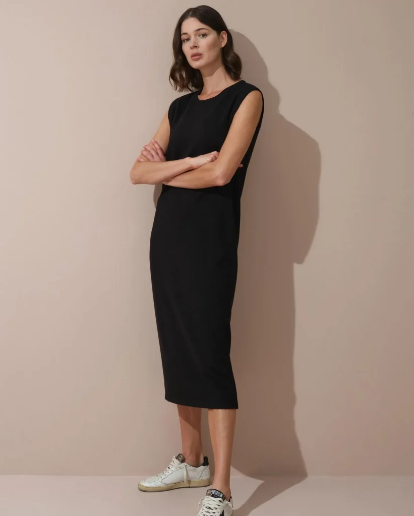 - The Form: A midi-length dress in a high-quality knit, such as merino wool or a heavy ribbed cotton. The silhouette should be simple and close to the body without being restrictive.