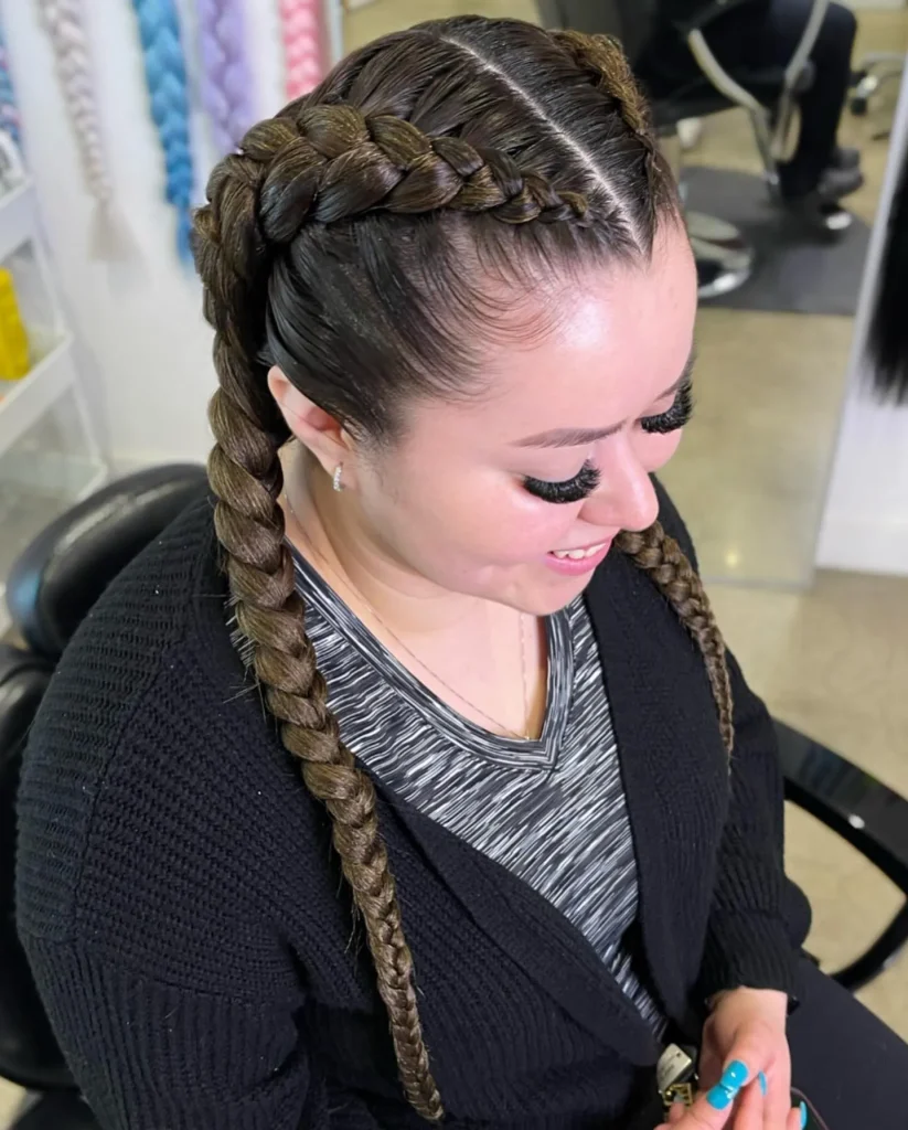 This unique and edgy hairstyle combines two braids that feed into a ponytail, giving a stylish and bold Latina baddie vibe. Itβs great for those who love to experiment with texture and layers.