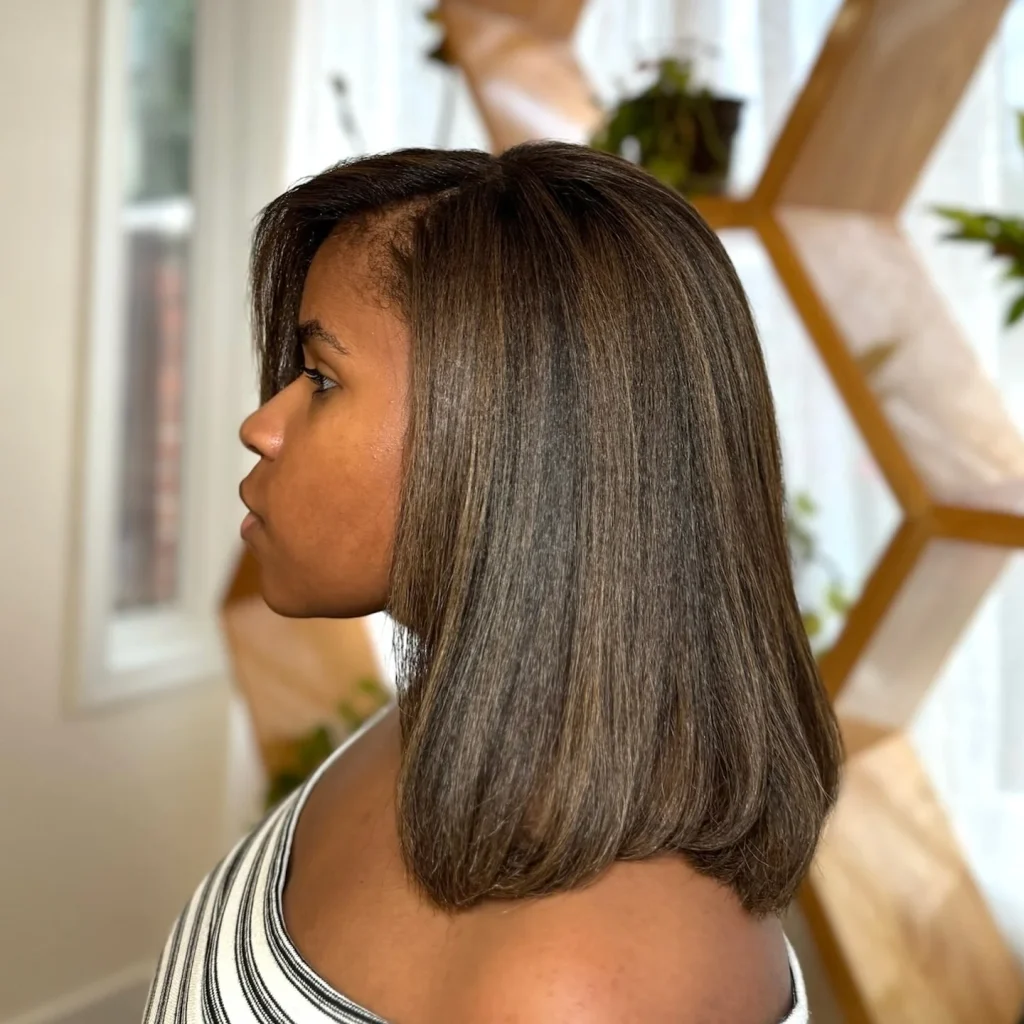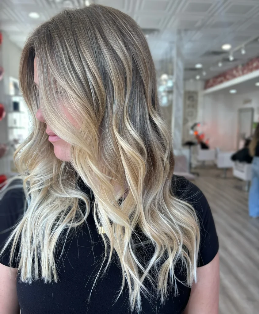 A natural, golden blonde with subtle highlights that mimic the sun’s natural lightening effect.