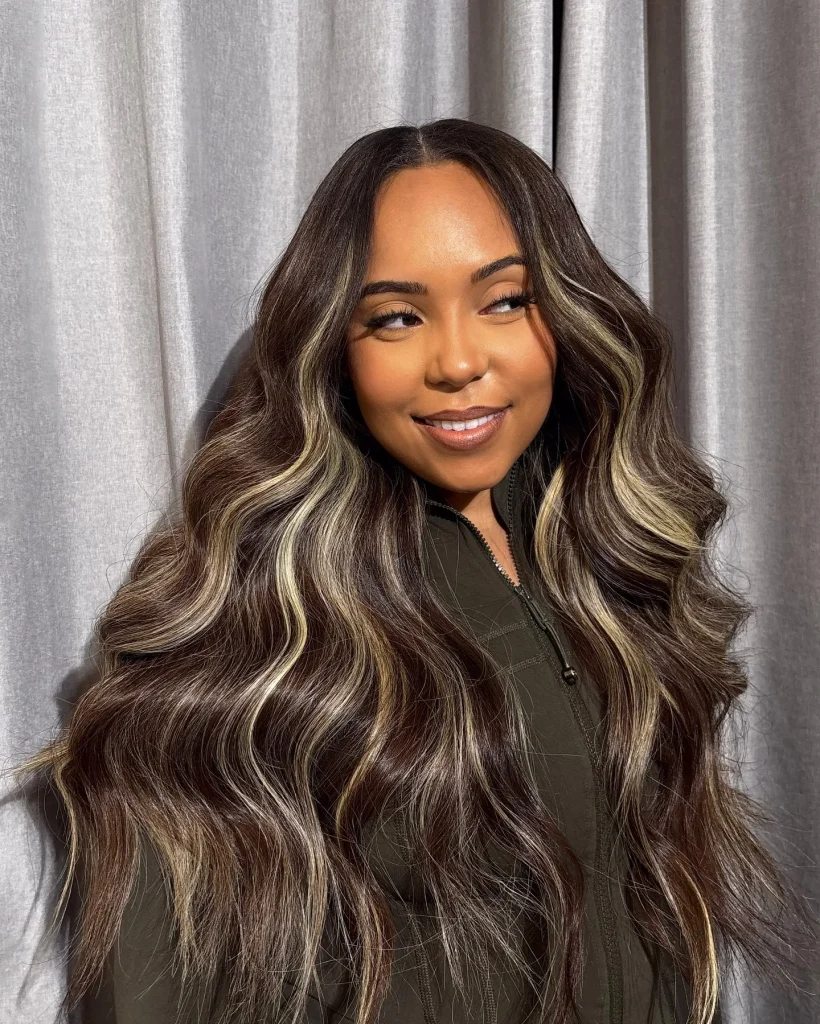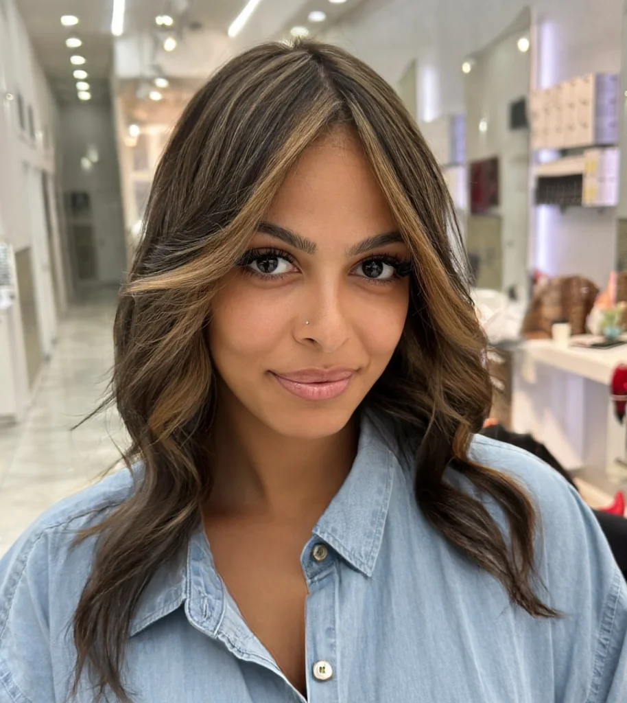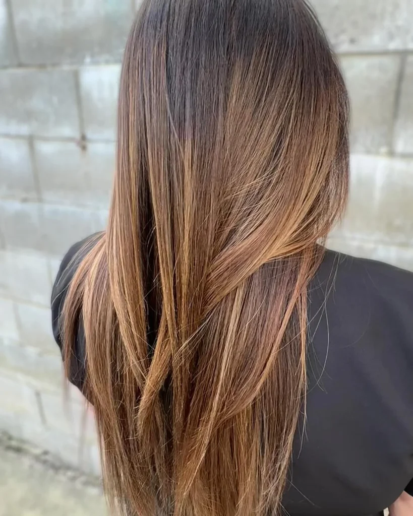A rich brunette base with caramel highlights for a sunlit effect.