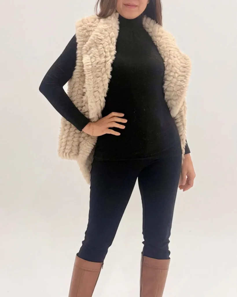 Winter leggings get a glow-up with a faux fur vest. It adds warmth and texture without bulk. Pair it with knee-high boots and a slouchy beanie for a full-on cozy-meets-chic look.