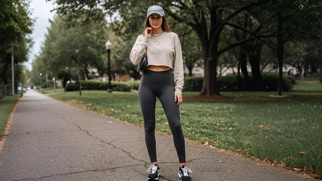 Summer leggings outfit ideas don’t always have to be light and airy. A cropped sweatshirt adds just enough sporty edge without sacrificing style.