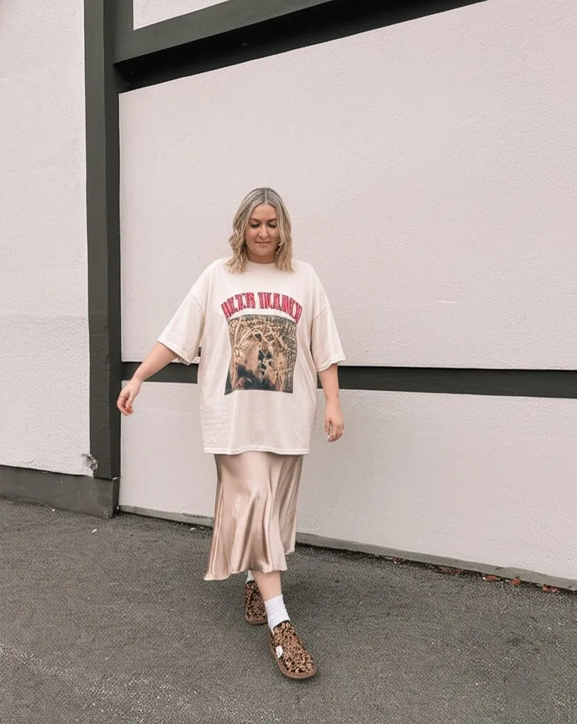 30. Oversized Graphic Tee with a Satin Midi Skirt
