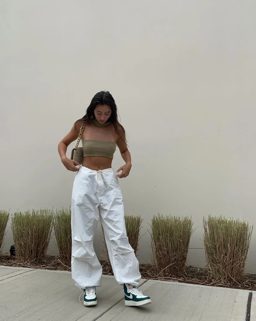 Streetwear meets chic. Parachute pants are trending, and when styled with a fitted top, they create an effortless look.