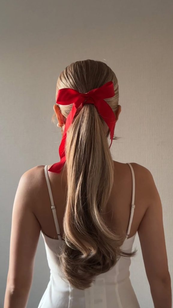 Add a statement scrunchie, ribbon, or bow to your high ponytail for a playful, eye-catching look.