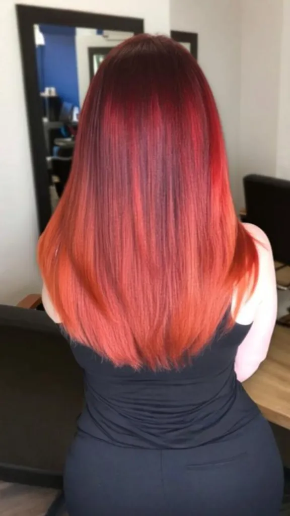 The contrast between the dark roots and the fiery orange highlights creates a striking, dramatic look that’s sure to make you stand out this fall.