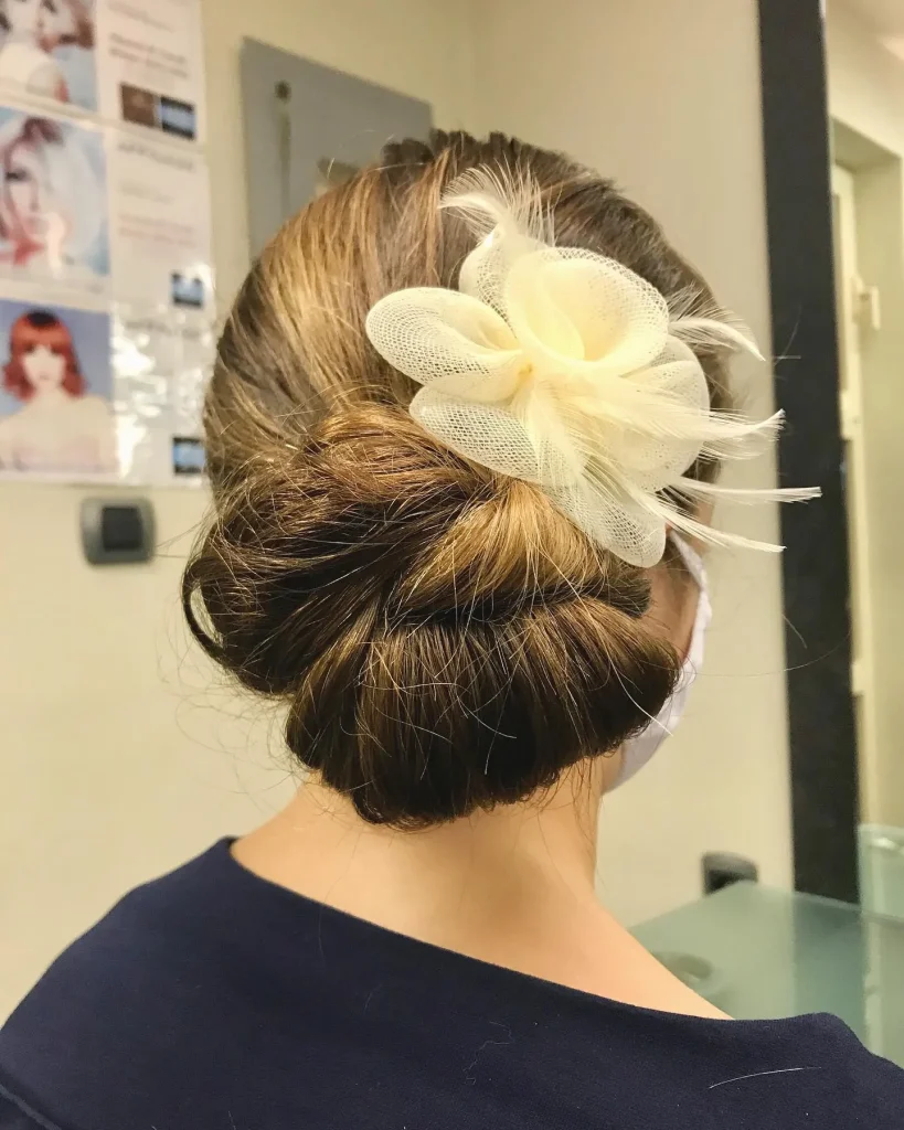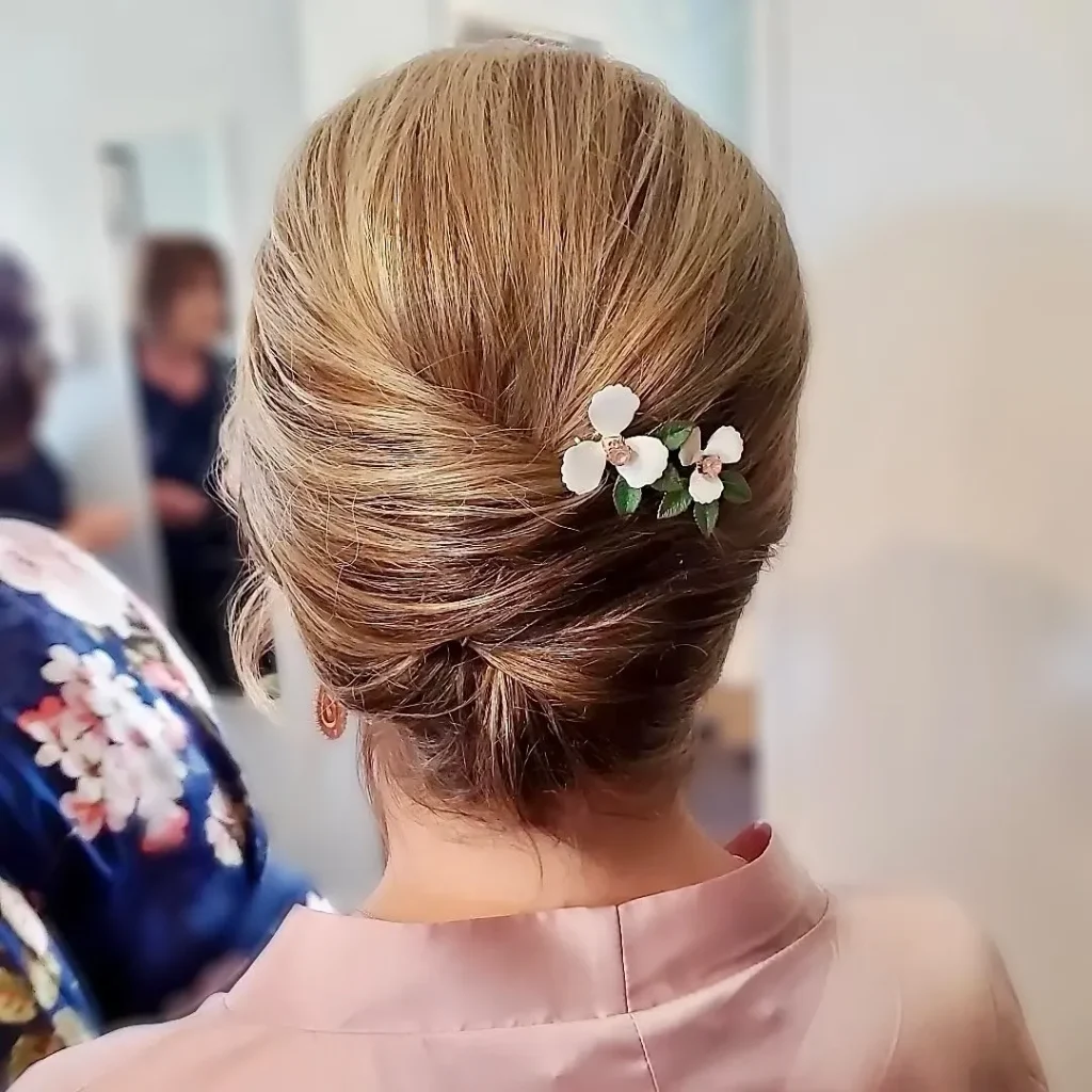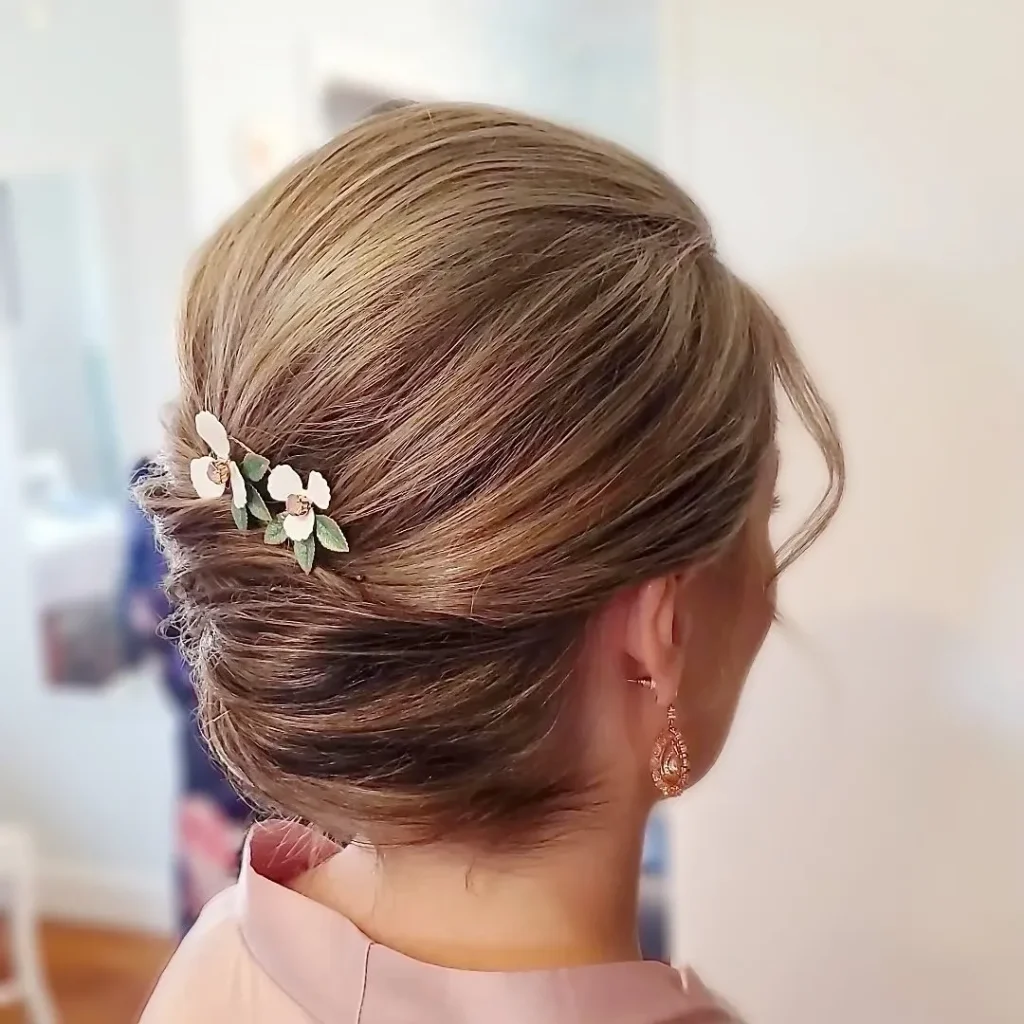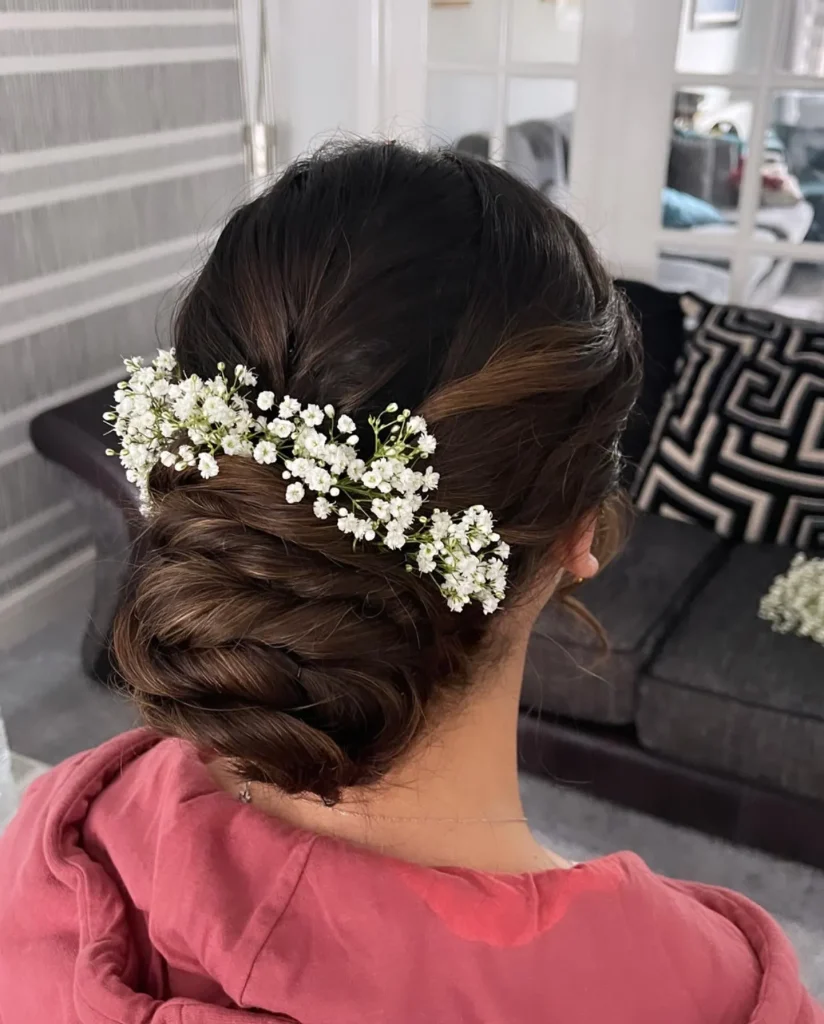Incorporating flowers into your updo adds a charming, romantic element. This style is perfect for weddings or garden parties.