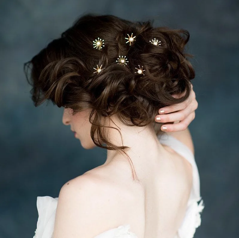 - Twist sections of your hair back and secure them with pearl or gem pins.