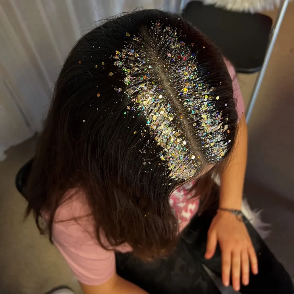 - Apply hair-safe glitter along your roots for a dazzling touch.