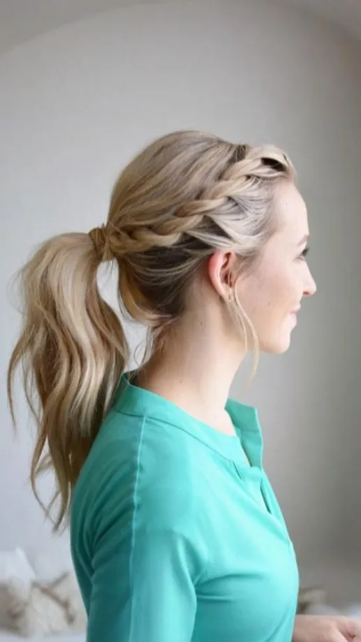 Choose a side and create a French, Dutch, or simple three-strand braid starting near your temple, angling it back and down towards where you want your ponytail to sit (low, mid, or high). Once the braid reaches that point, gather all your hair, including the end of the braid, into a ponytail and secure.