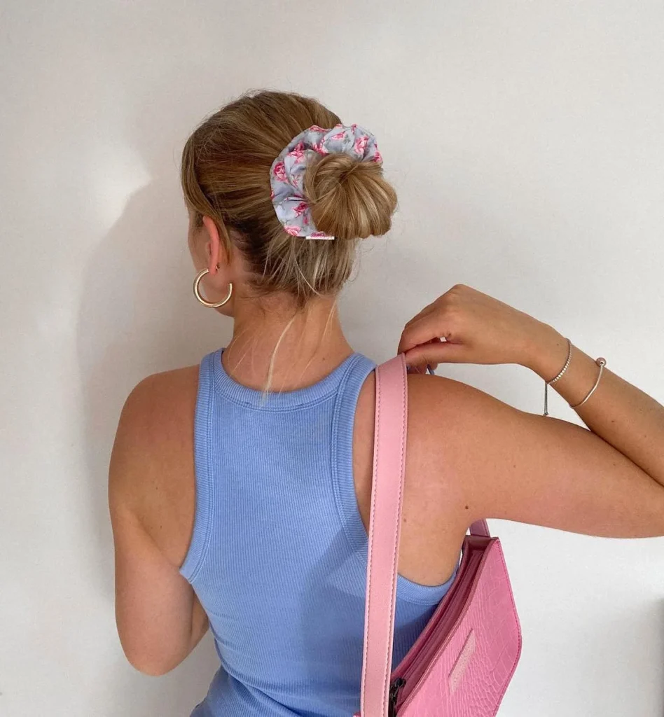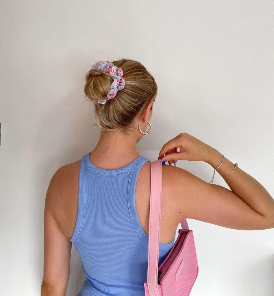 Add a little retro flair with a top knot and a scrunchie! It’s the perfect throwback that’s also functional and keeps everything in place.