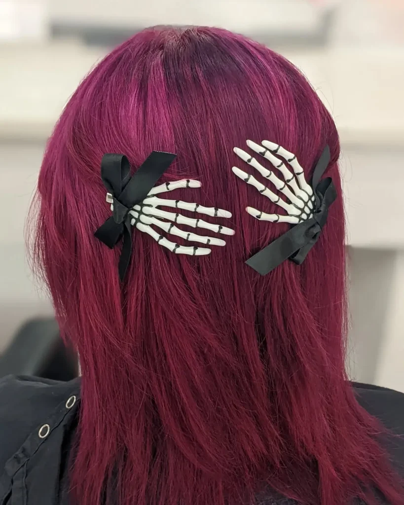 Looking for something simple, spooky, and chic? This is it! You just style your hair how you love it, then add some cool skeleton hand clips. It’s an instant dose of Halloween spirit!