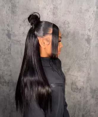 For a sleek, polished appearance, straighten your hair and pull it into a high top knot. Perfect for both casual and formal settings.
