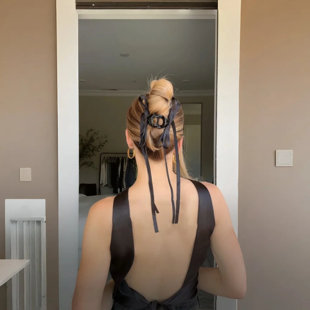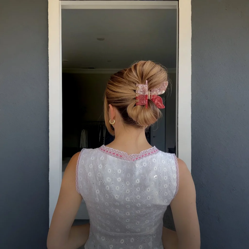 A bow-adorned claw clip updo for a sweet, feminine charm.