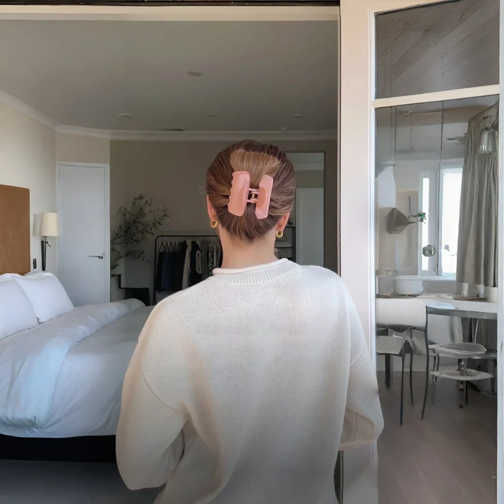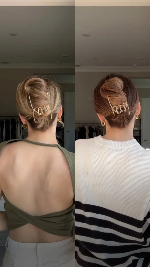 A stylish and quick updo using a claw clip positioned at an angle for a sleek, asymmetrical look.