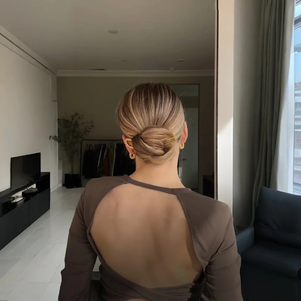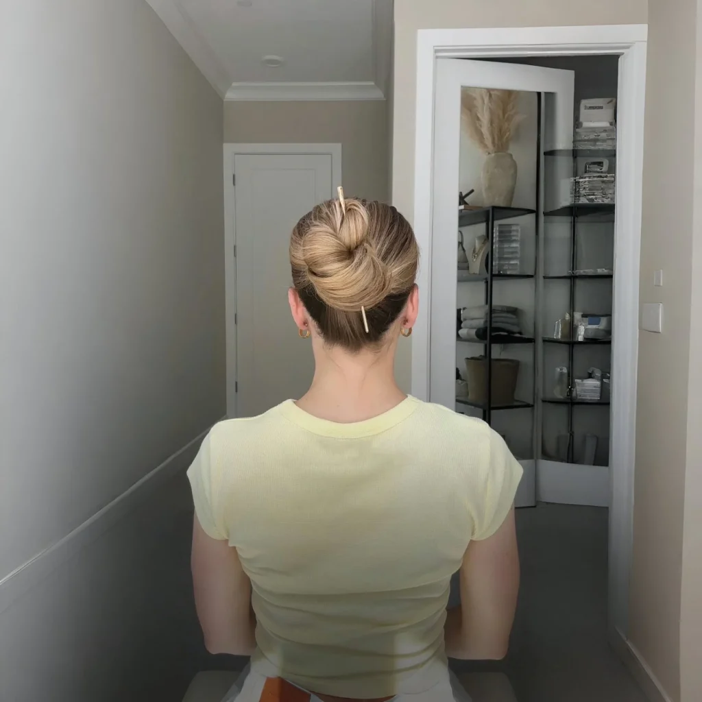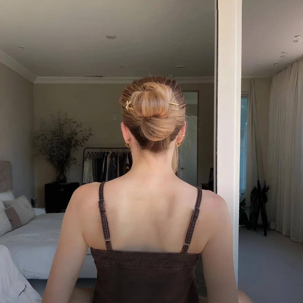 A tightly wrapped bun secured with an elegant hair pin for a polished, vintage-inspired look.