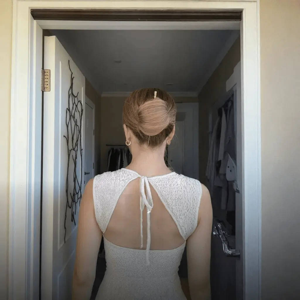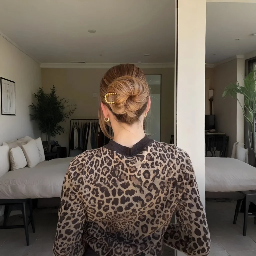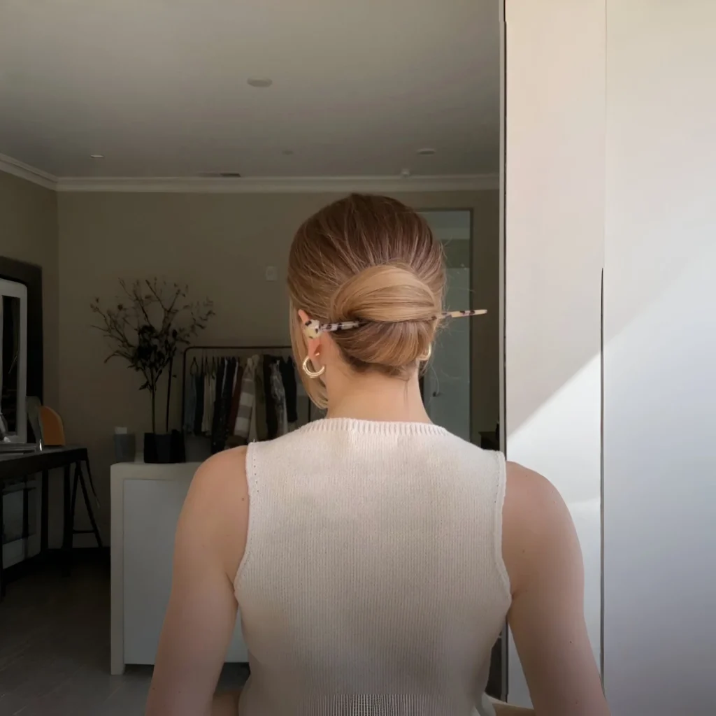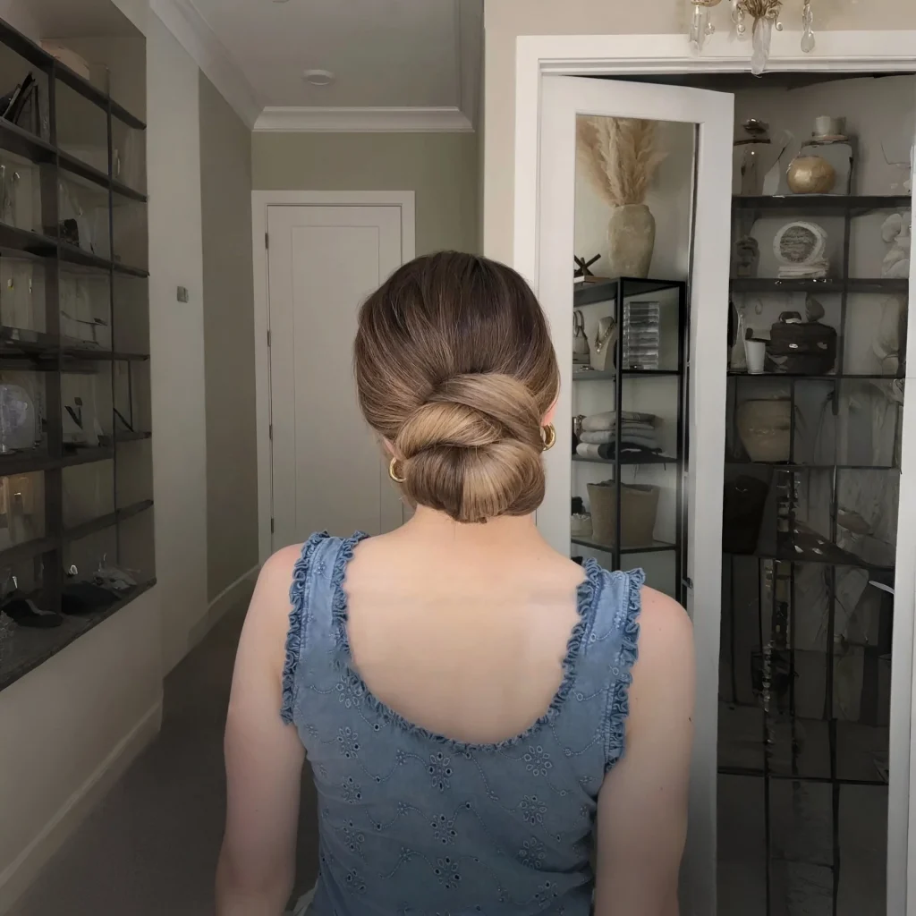 A tightly wrapped bun secured with an elegant hair pin for a polished, vintage-inspired look.