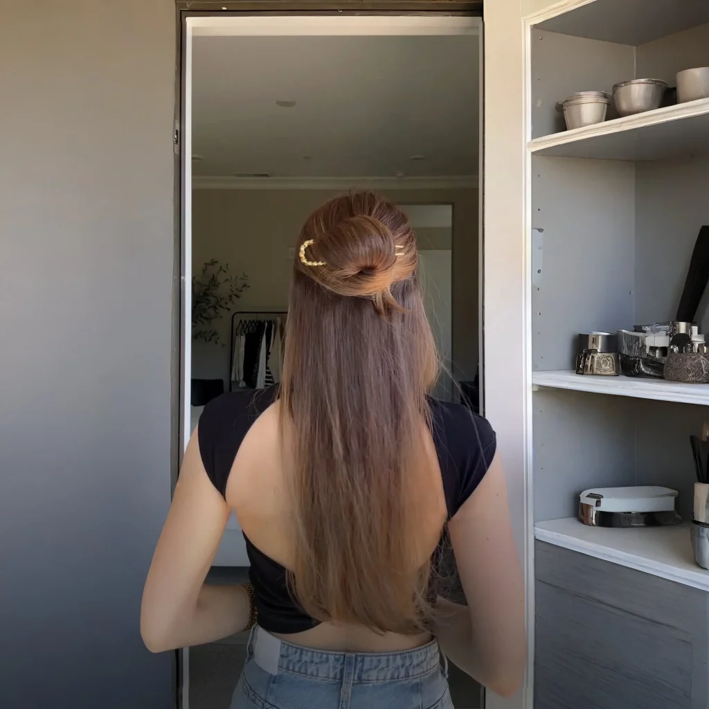 Soft and airy, this updo tucks hair into a claw clip, creating an ethereal, floating effect.