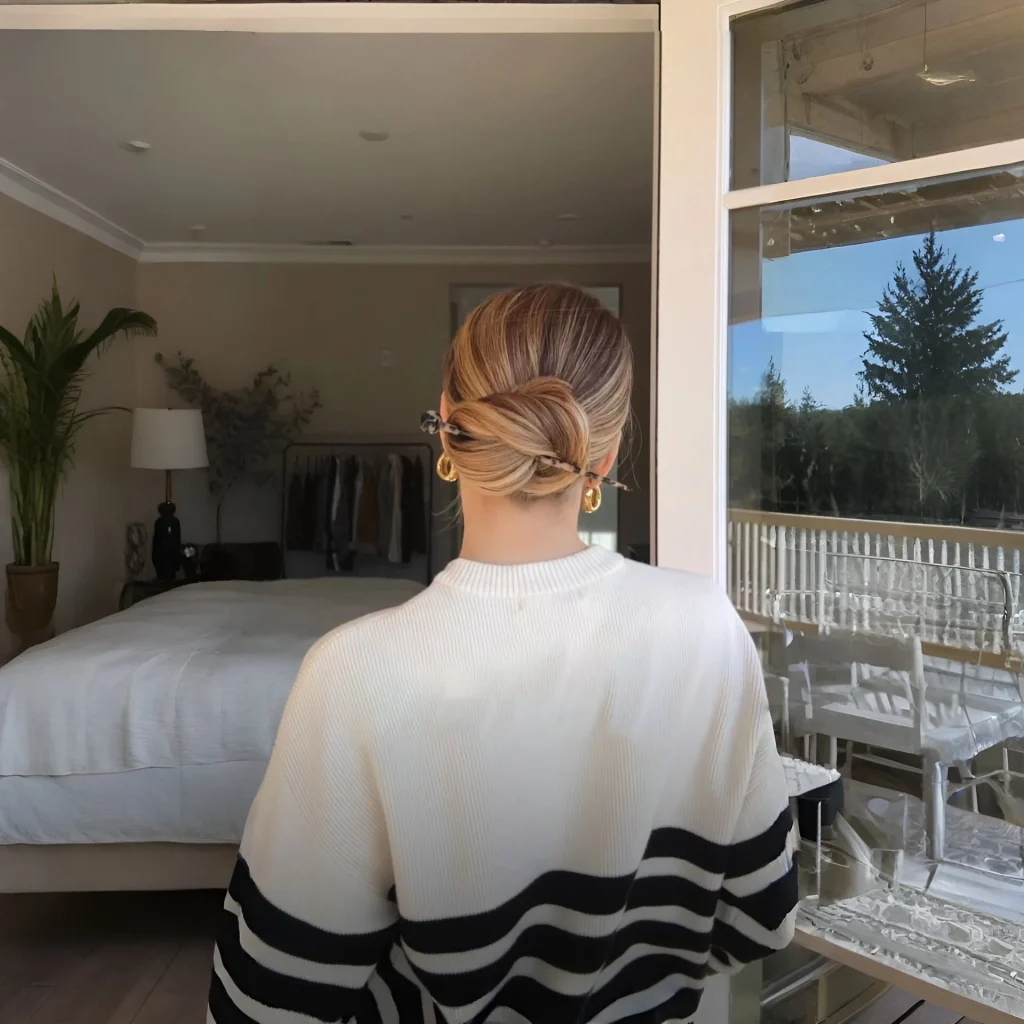 A French-inspired chignon secured with a hair stick for a sleek effect.