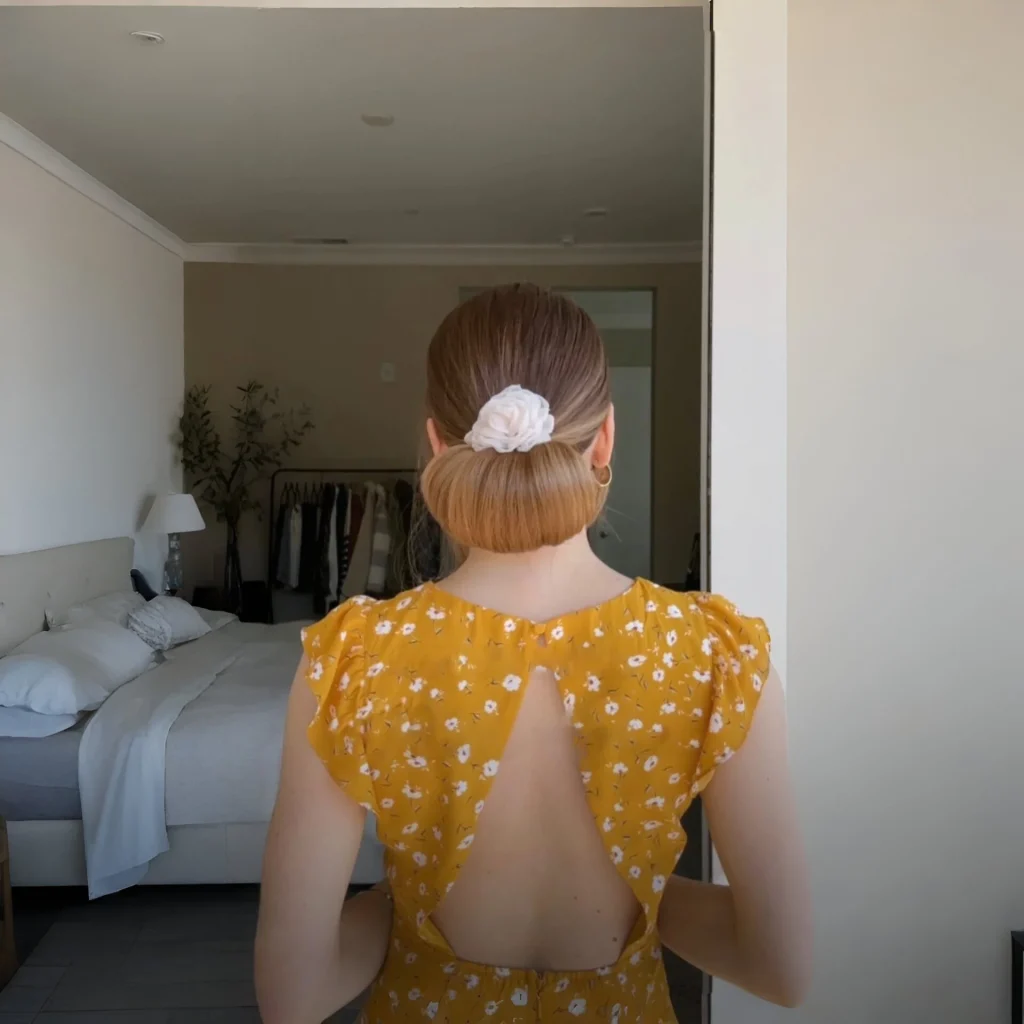 A simple yet stylish bun secured with a scrunchie for a retro touch.