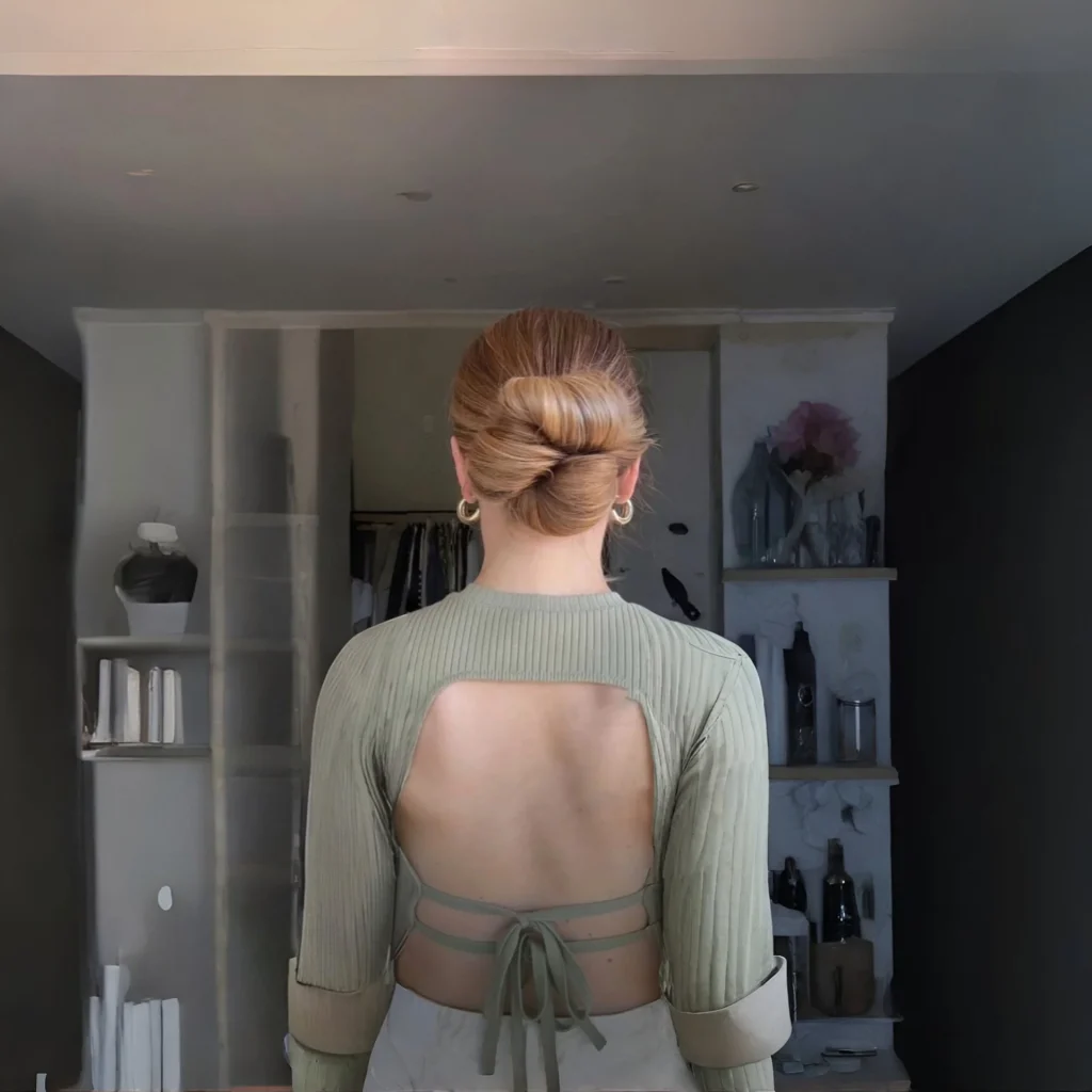A sleek, flat twist pinned to the head for a modern, minimalist updo.
