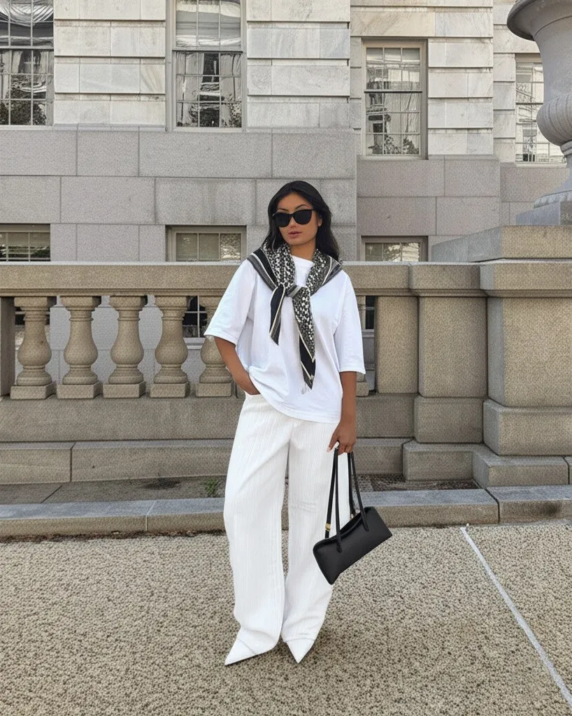 - The white t-shirt contrasts beautifully with the flowy pants.