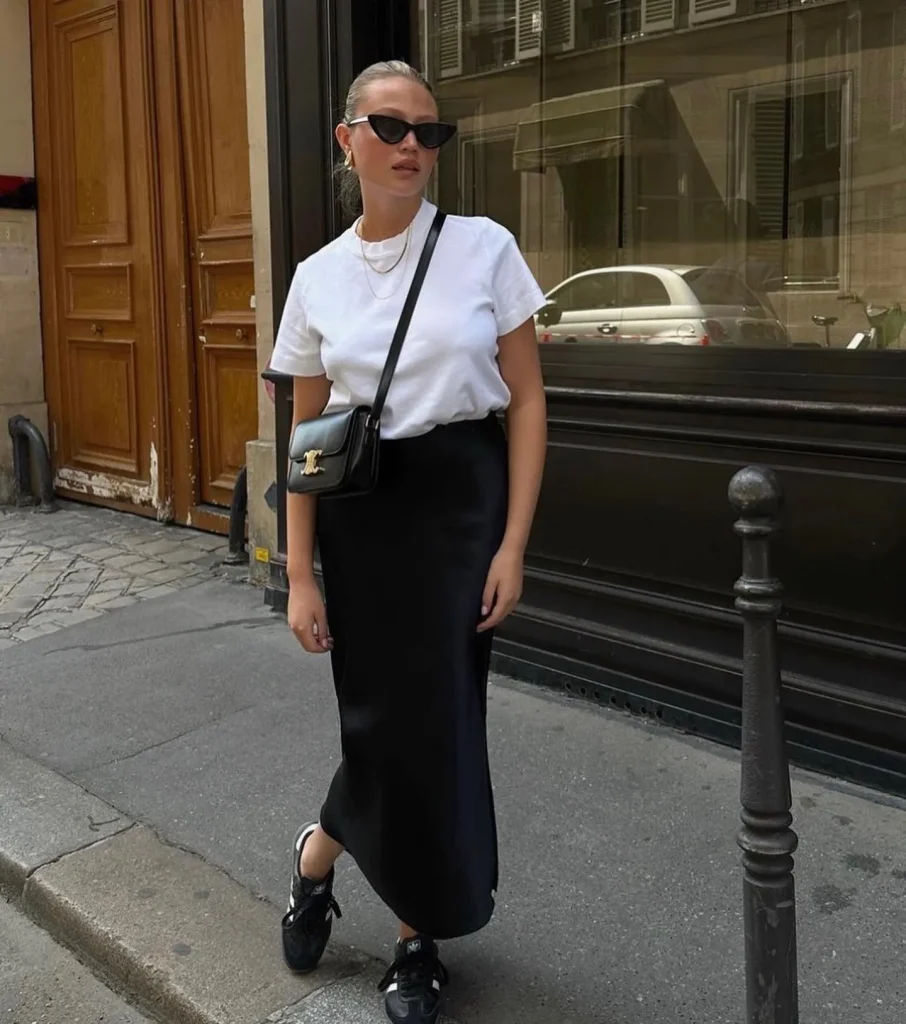- The combination of a simple tee and skirt looks chic and effortless.
