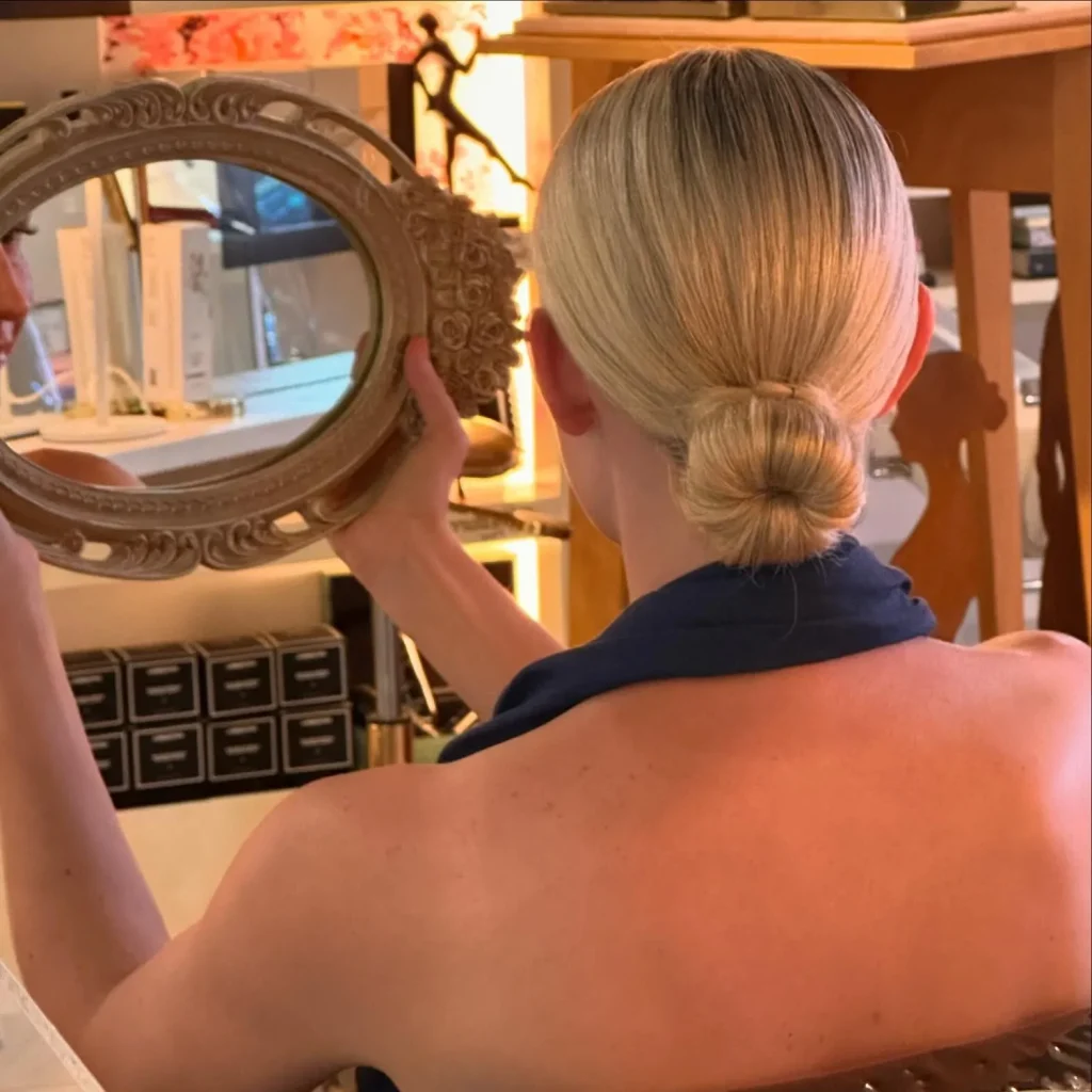 An iconic updo where hair is swept back, twisted vertically, and pinned into a sleek, sophisticated roll. It exudes timeless elegance and a polished, “old money” aesthetic.