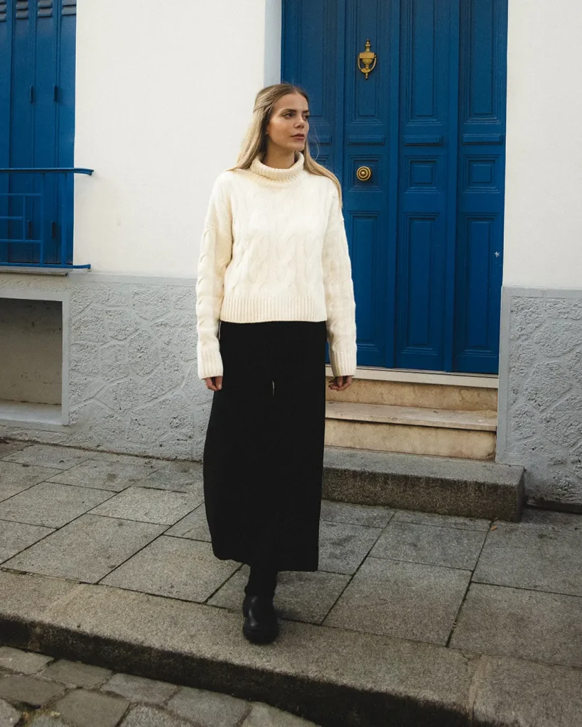 - How to Choose Yours: Opt for a high-quality cashmere or merino wool sweater in a classic crewneck or turtleneck style. Pair it with a pleated midi skirt, a simple A-line, or a pencil skirt.