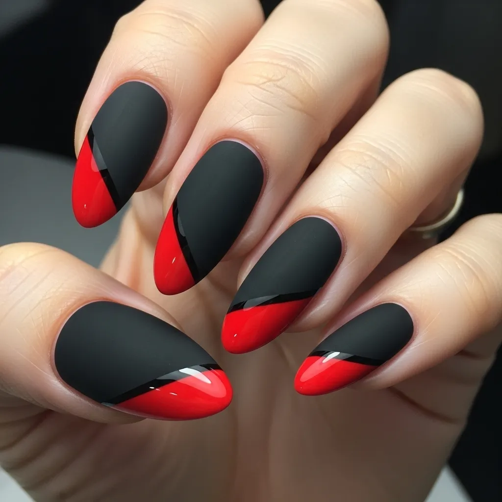 An almost entirely black manicure, with a single, sharp red detail. This could be a red accent nail, a red micro-French tip, or a red heart on a black base. The strategy is contrast. The black makes the red pop with dramatic effect.