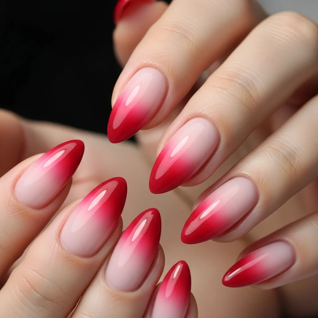 A smooth gradient of color on each nail, fading from a soft pink at the cuticle to a rich red at the tip. The strategy is to use a classic color combination in a dynamic, blended application.