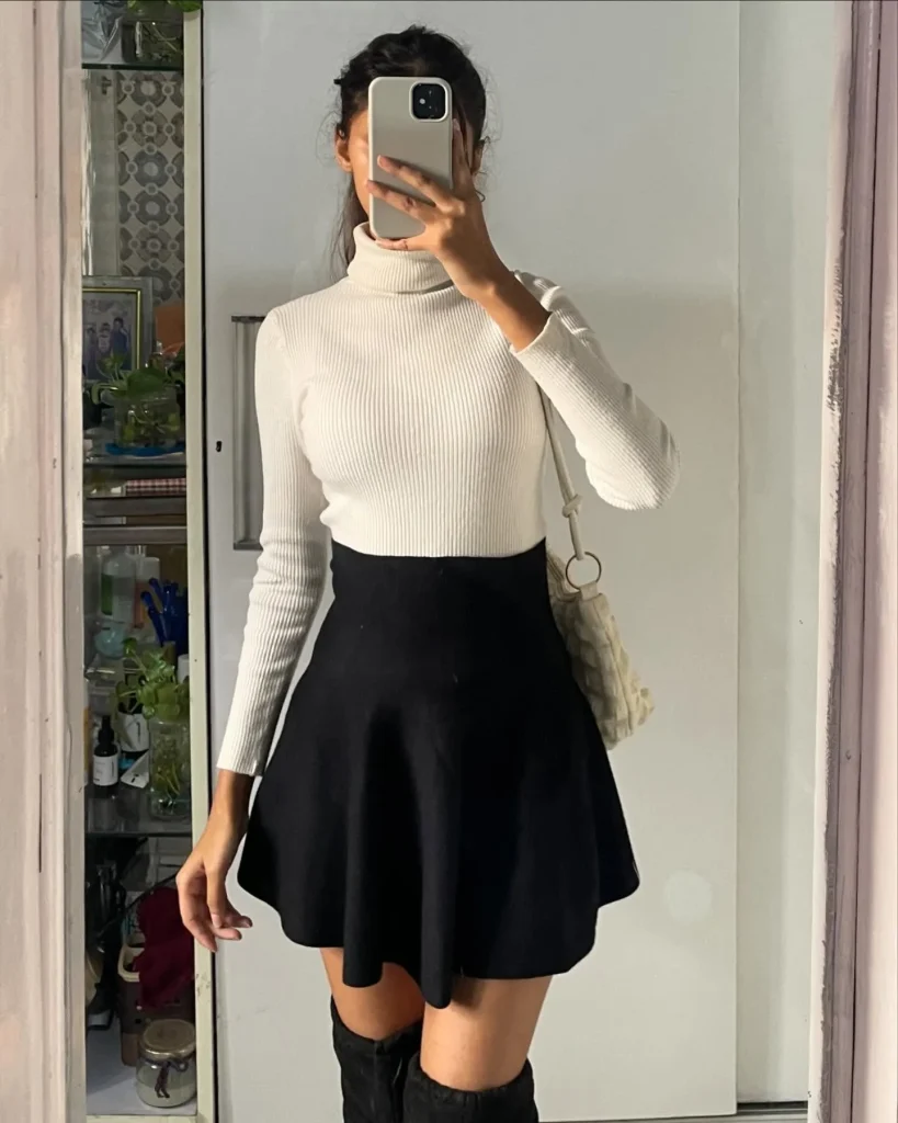 - Pair with a tucked-in blouse or puff-sleeve top.